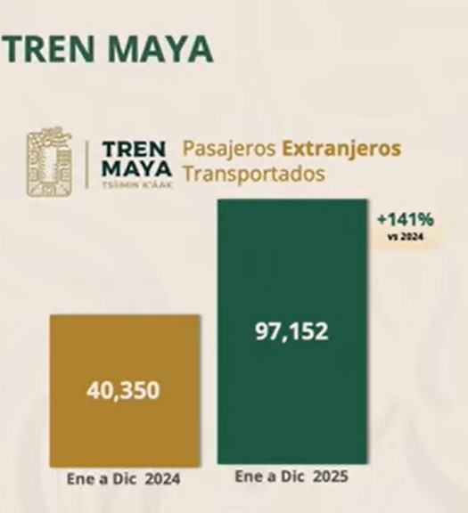 El Tren Maya incrementó la cifra de pasajeros internacionales que mueve en más del doble, al pasar de 40 mil 350 en 2024 a más de 97 mil en 2025, lo que representa un alza del 141%, reveló Josefina Rodríguez Zamora, titular de la Secretaría de Turismo (Sectur) federal.